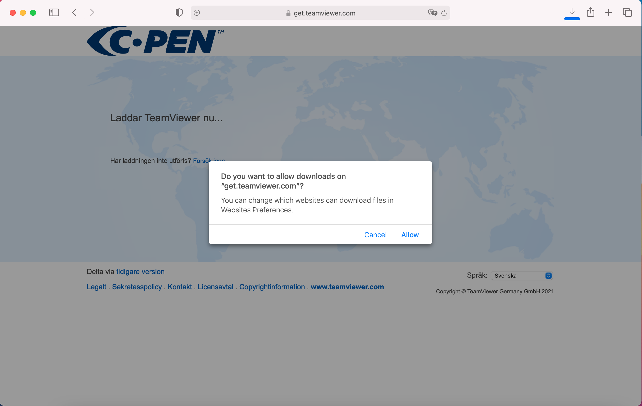 | After clicking the download link (https://get.teamviewer.com/cpen-support), click Allow. | ![]() |