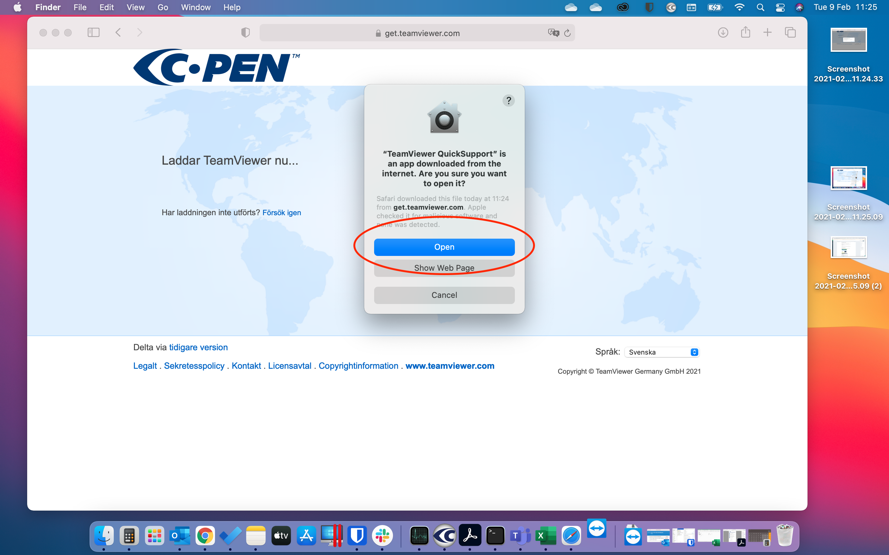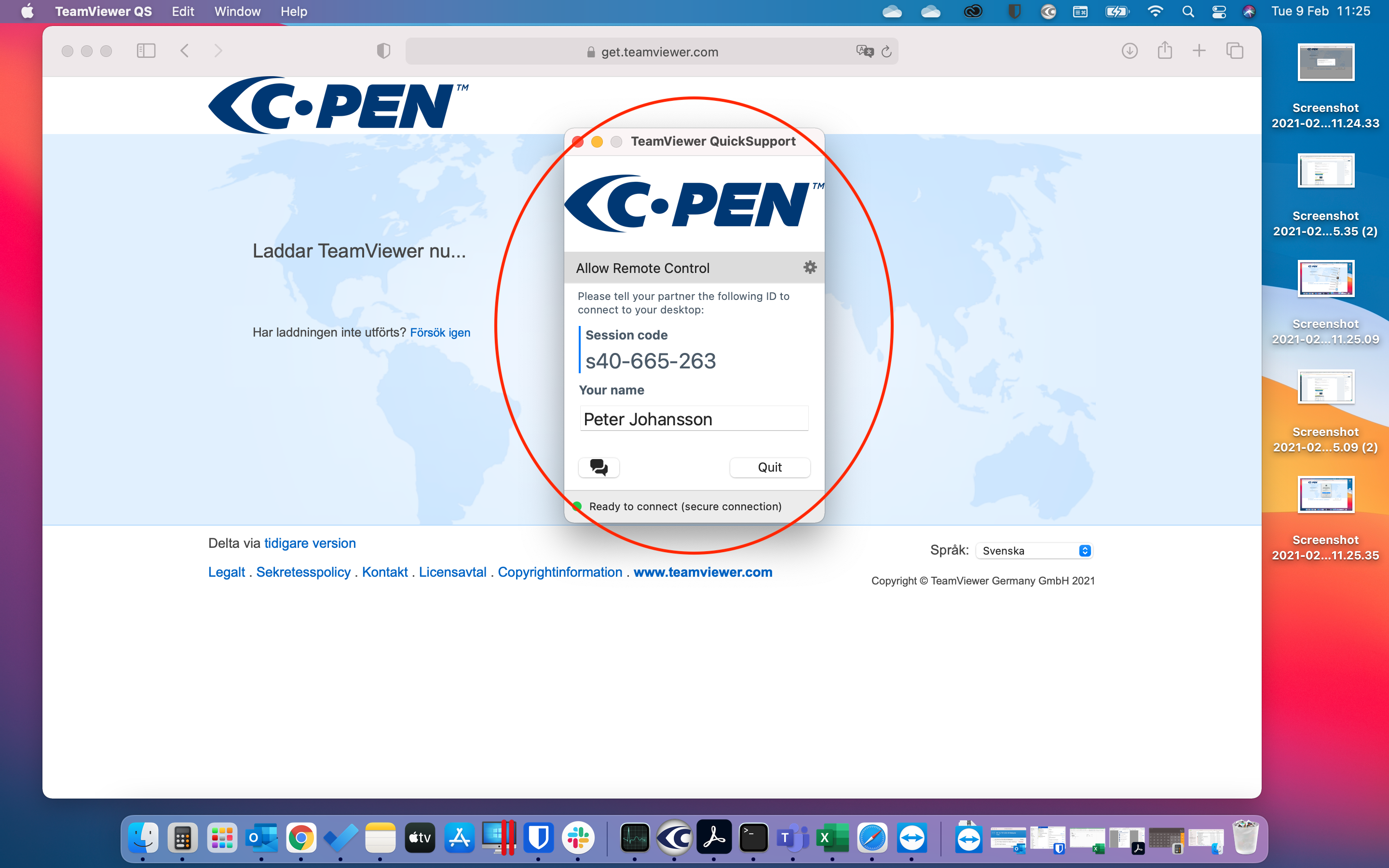 | Now, it shall look like this on both Windows and MAC. When TeamViewer is started the C-PEN Helpdesk agent is automatically notified and will connect within the next few minutes. | ![]() |